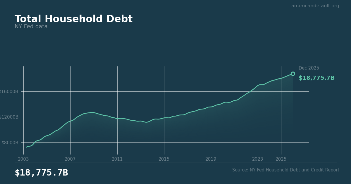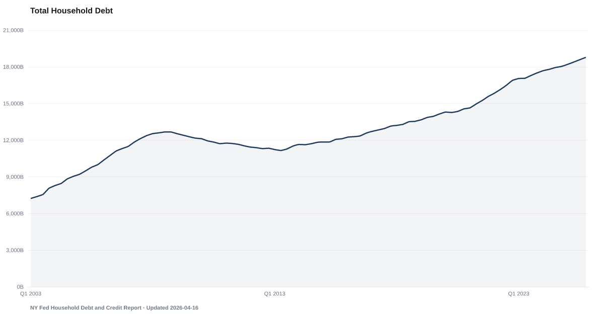 Total U.S. household debt — including mortgages, credit cards, auto loans, student loans, and HELOCs — reached $18.78 trillion as of Q4 2025, according to the New York Fed's Household Debt and Credit Report. This aggregate captures the full stock of what American households owe across all debt types. Source: NY Fed Household Debt and Credit Report.