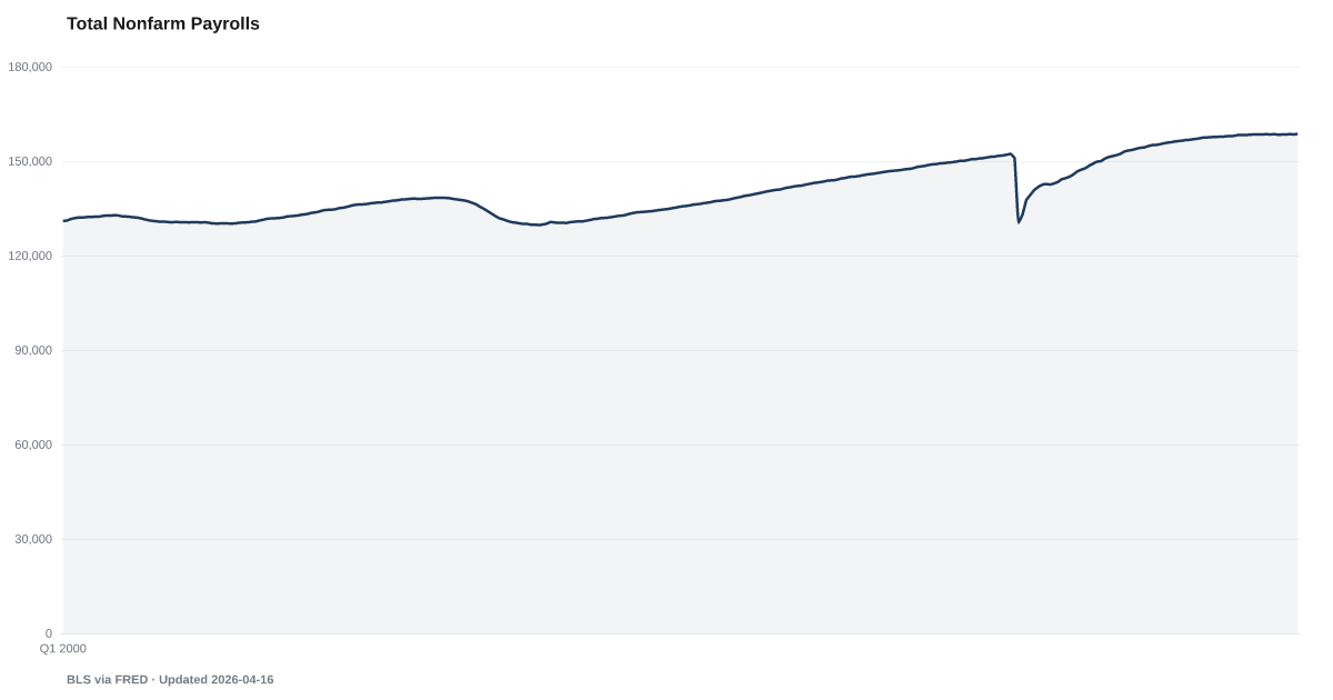 BLS data. Total nonfarm employment is at all-time highs. The headline masks composition shifts: many new jobs are lower-wage, part-time, or in sectors with higher turnover.