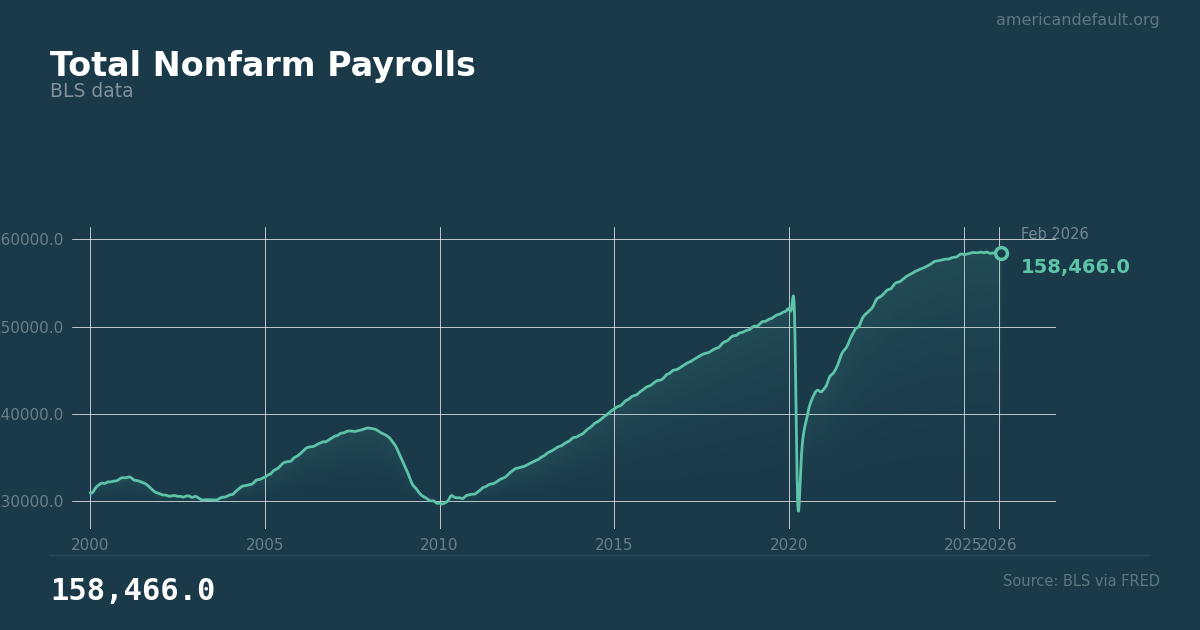 Nonfarm payrolls count the total number of paid U.S. workers excluding farm employees, private household employees, and nonprofit organization employees. At 158.5 million, it is the broadest measure of U.S. employment.