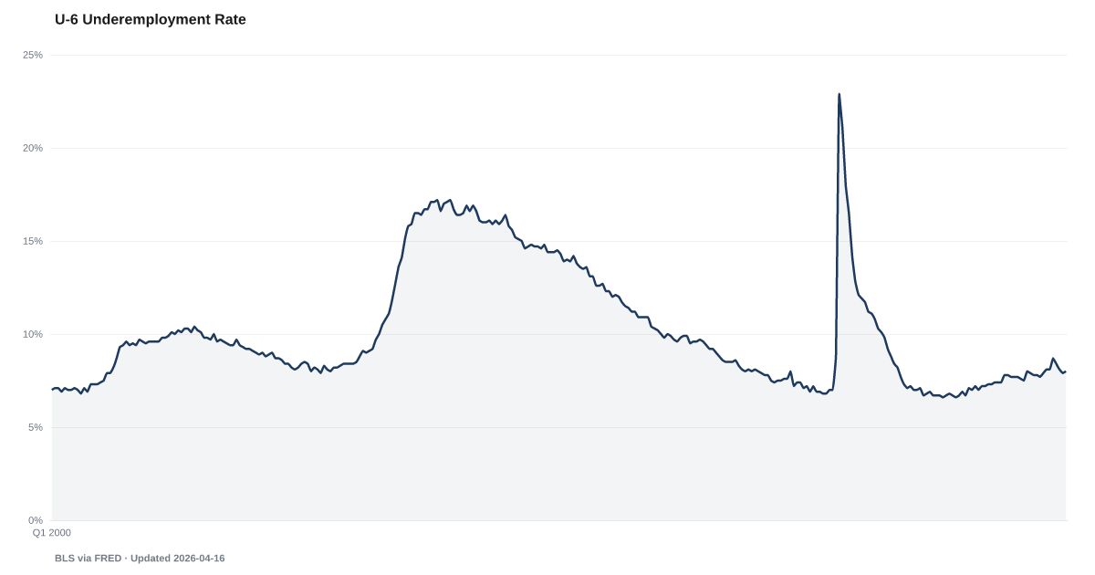 U-6 Underemployment Rate: 8% as of 2026-03, and improving. Source: BLS via FRED.