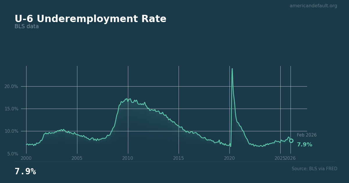 BLS data. At 7.9%, the U-6 counts discouraged workers and involuntary part-timers the headline rate ignores. The gap between U-3 (4.4%) and U-6 reveals the slack the topline hides.