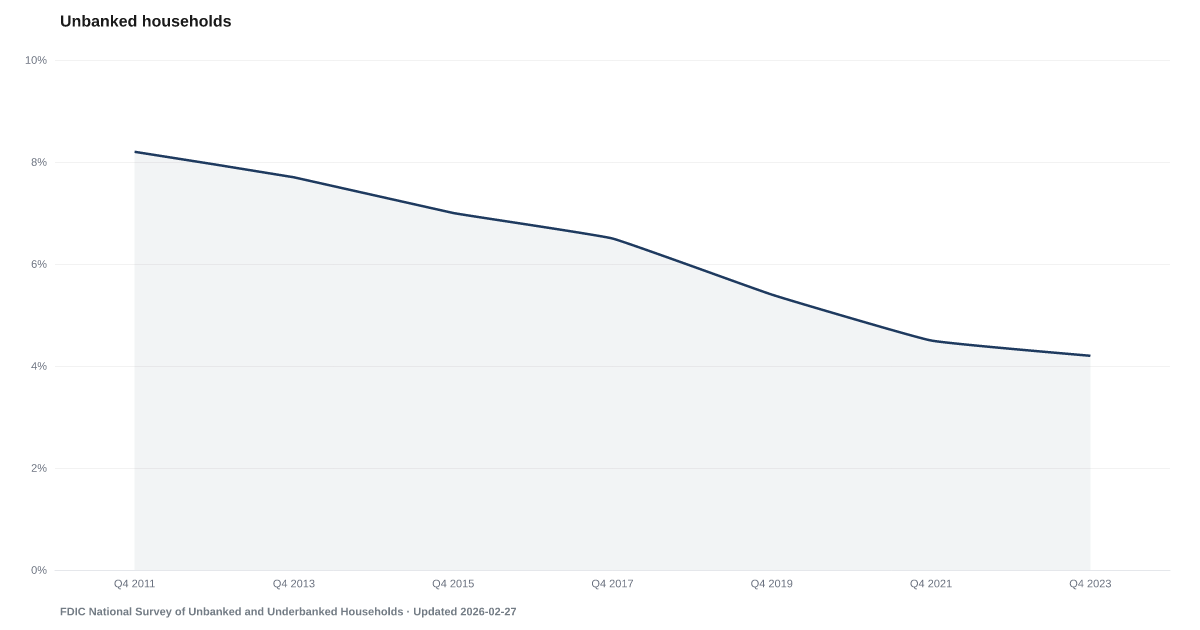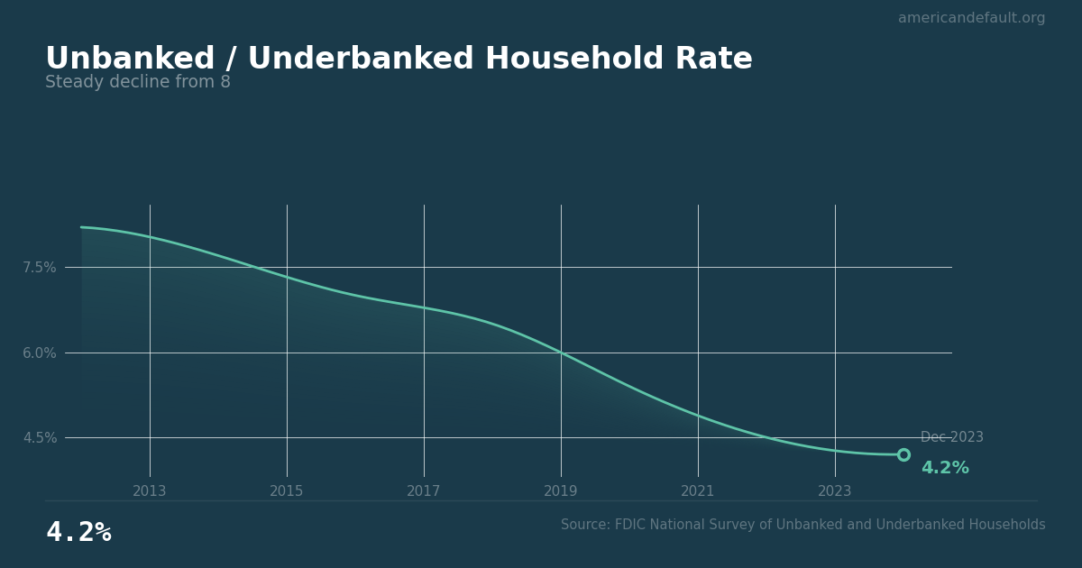 Unbanked / Underbanked Household Rate: 4.2% as of 2023, and improving. Source: FDIC National Survey of Unbanked and Underbanked Households.