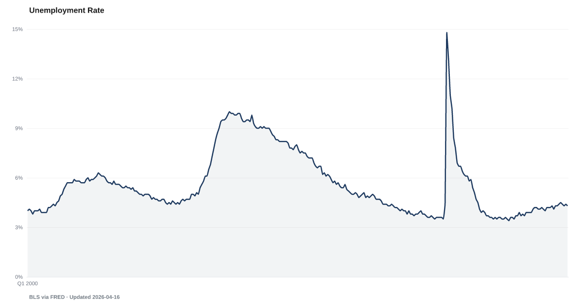 The U.S. unemployment rate (U-3) measures the share of the labor force that is actively seeking work but cannot find it. As the headline employment statistic, it is the most widely watched measure of labor market health, though it understates true labor market slack by excluding discouraged workers and involuntary part-time workers. Source: Bureau of Labor Statistics, Current Population Survey.