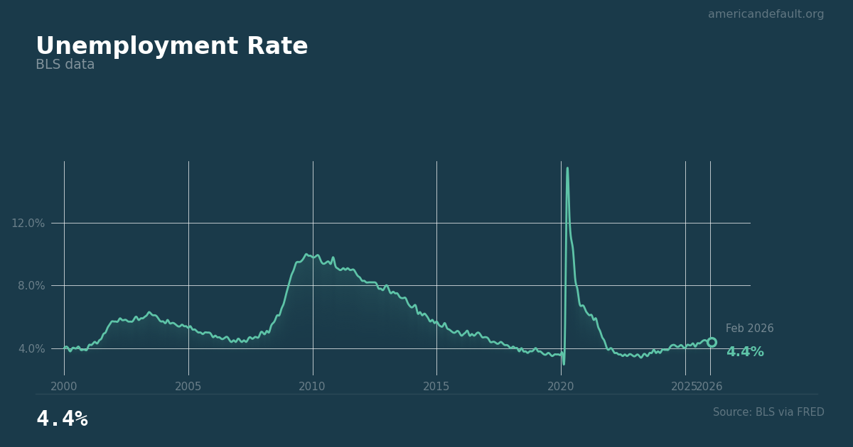 The U.S. unemployment rate (U-3) is published monthly by the Bureau of Labor Statistics. It measures the share of the civilian labor force that is jobless and actively seeking employment. Check the American Default indicator page for the latest reading.